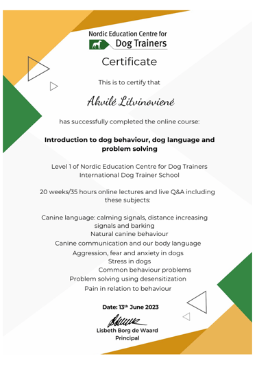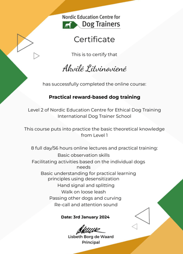 Šunų dresūra mane žavėjo nuo vaikystės. Vis dėlto gilesnis žvilgsnis į šuns psichologijos pasaulį mane patraukė 2023-aisiais, kai atradau norvegų šunų trenerių mokyklą „Nordic Education Centre for Ethical Dog Training“. Jų filosofija man pasirodė nepaprastai artima ir įkvėpė šią žinutę skleisti Lietuvoje.