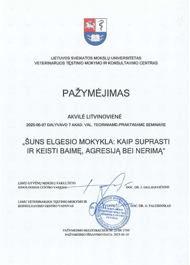 Siekiu, kad Lietuvoje šunų gerovė būtų matoma ne tik per dresūros prizmę, bet ir per nervų sistemos balansą, emocinį saugumą bei gilaus ryšio kūrimą tarp žmogaus ir šuns.