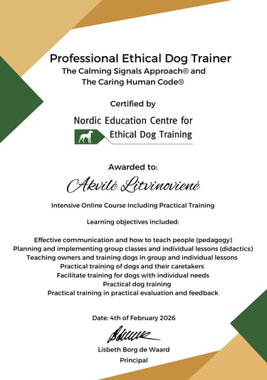 Siekiu, kad Lietuvoje šunų gerovė būtų matoma ne tik per dresūros prizmę, bet ir per nervų sistemos balansą, emocinį saugumą bei gilaus ryšio kūrimą tarp žmogaus ir šuns.